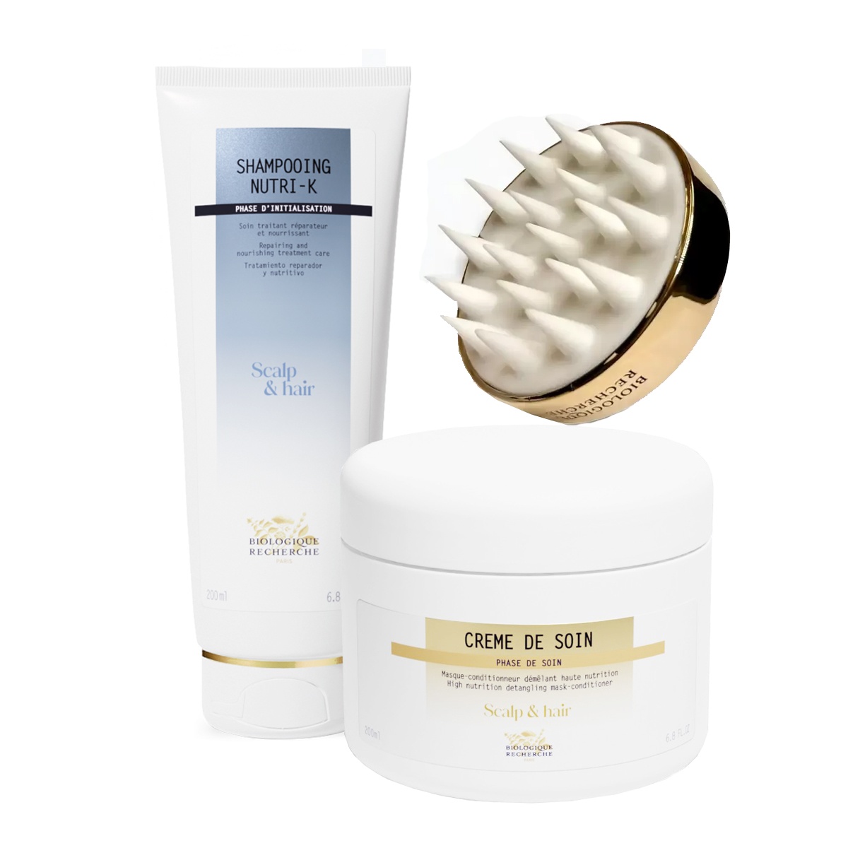 В составе набора: Шампунь Nutri-K 200 ml, Кондиционер для волос Creme de Soin 200 ml, Массажер для кожи головы Scalp Care Brush.