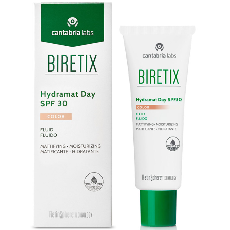 Легкий быстро впитывающийся тональный флюид BIRETIX Hydramat Day Color SPF30 для дневного ухода за жирной и комбинированной кожей, склонной к акне, с расширенными порами и высыпаниями.