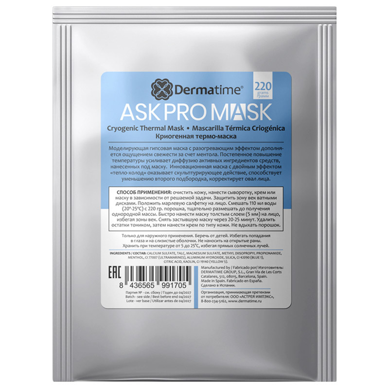 Применение: очистить кожу, нанести сыворотку, крем или маску в зависимости от решаемой задачи: увлажнение, питание, осветление, антивозрастной уход и т.д. Защитить зону век ватными дисками. Нанести марлевую салфетку на все лицо. Смешать 110 мл воды (20º-25º) с 220 гр. порошка, тщательно размешать до получения однородной массы. Быстро нанести маску толстым слоем (5 мм) на кожу лица, избегая зону век. Снять застывшую маску через 20-25 мин. Удалить остатки маски тоником, затем нанести крем по типу кожи. Не вдыхать порошок.